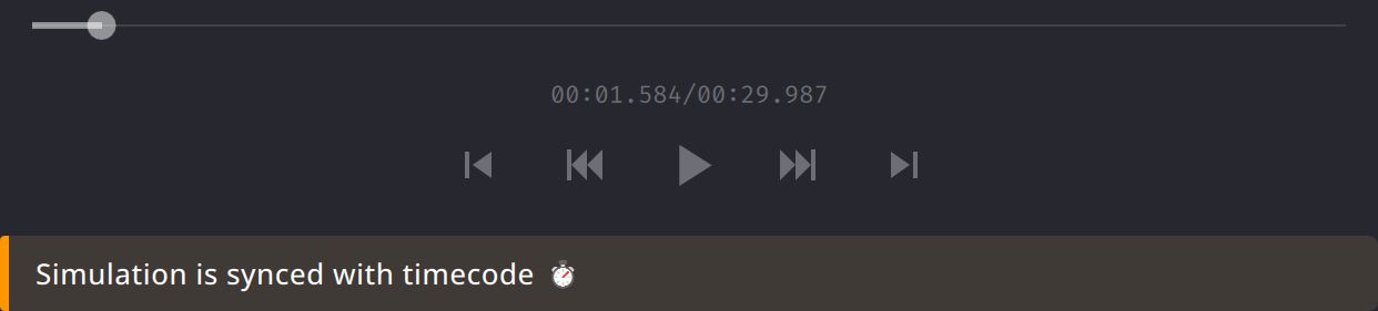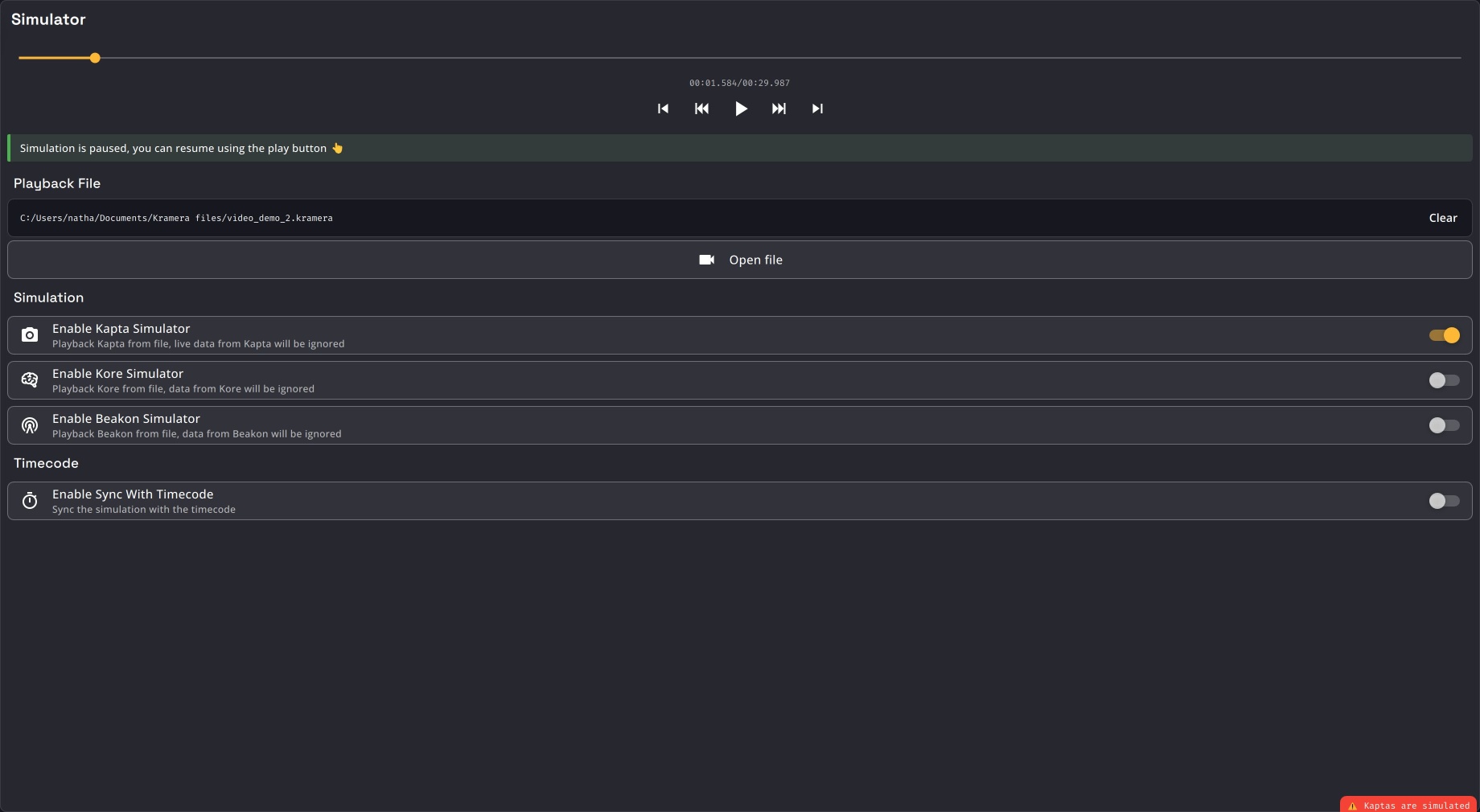 If you choose to synchronize the simulator player with a timecode input, you won't be able to move the player's timeline manually. The .kramera file will be played synced with the timecode.