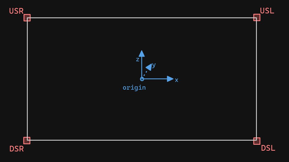 Once you've set up the Cal Markers, you should see the 4 markers on the Plot view (PLOT), as well as the dimensions of the rectangle you've set up. You can also see the names of each corner (USL, USR, DSL, DSR). (US = UpStage, DS = DownStage, L = Left, R = Right)