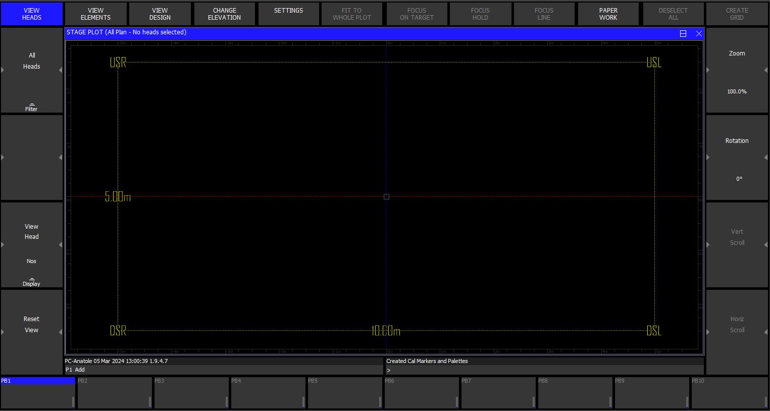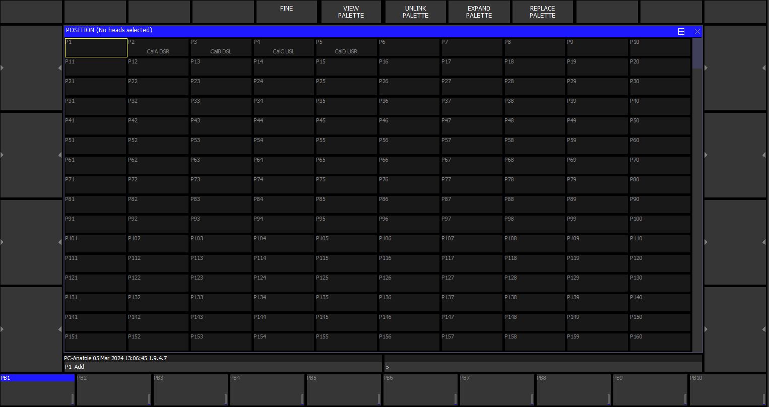 The console should also have created a new palette for each marker (USL, USR, DSL, DSR). You can now use these palettes to store the position of the fixture when it points at the corresponding marker.