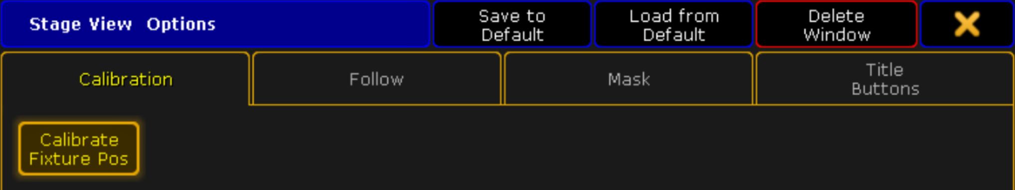 - Click on the yellow circle in the top left of the Stage View window and select "Calibrate Fixture Pos" in the "Calibration" tab.