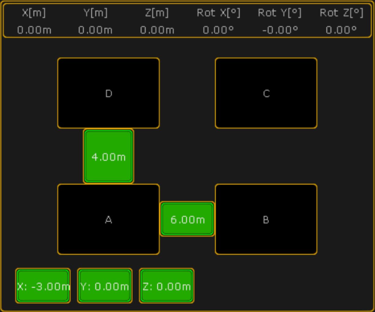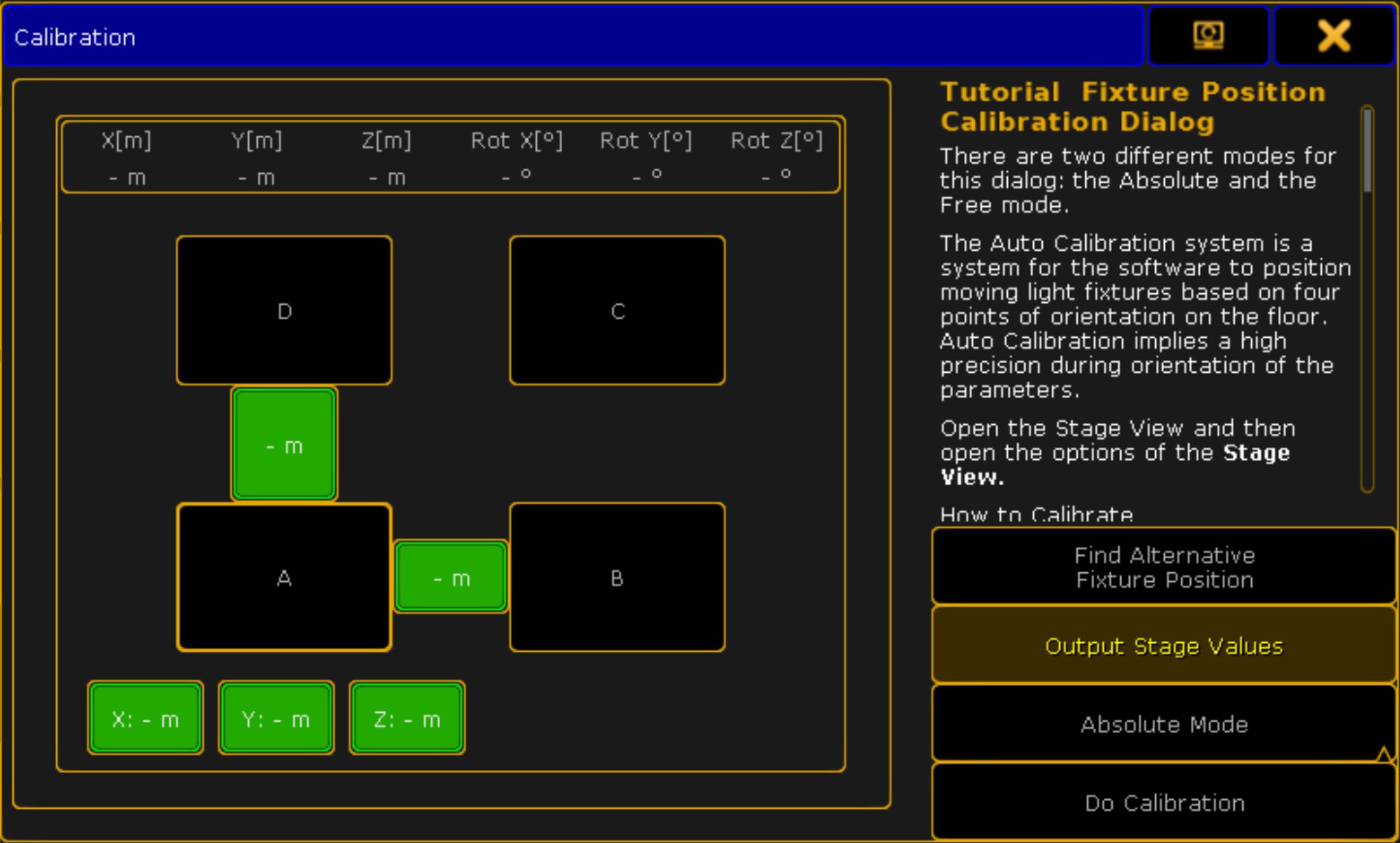 - If the rectangle needs to be on a sloping part of your stage then you need to use the Free mode. In this mode you define the X, Y and Z position of three corners (A, B and C). This mode is interesting if you can’t calibrate fixtures by drawing a rectangle on the floor so you can draw the rectangle on a wall for example.