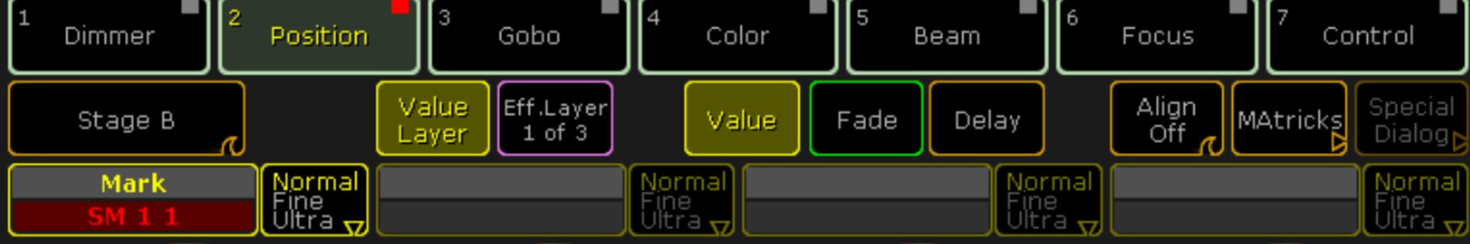 - Select the fixtures, go to Stage B in the preset type Position and select the Stage Marker you want the fixture to point to.