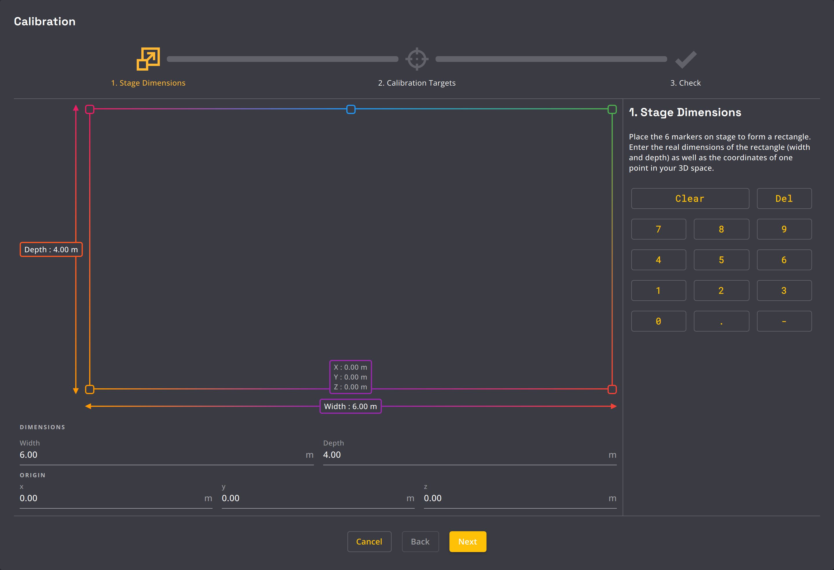 - Stage dimensions page, where you provide the dimensions and position of the rectangle you drew on the floor.