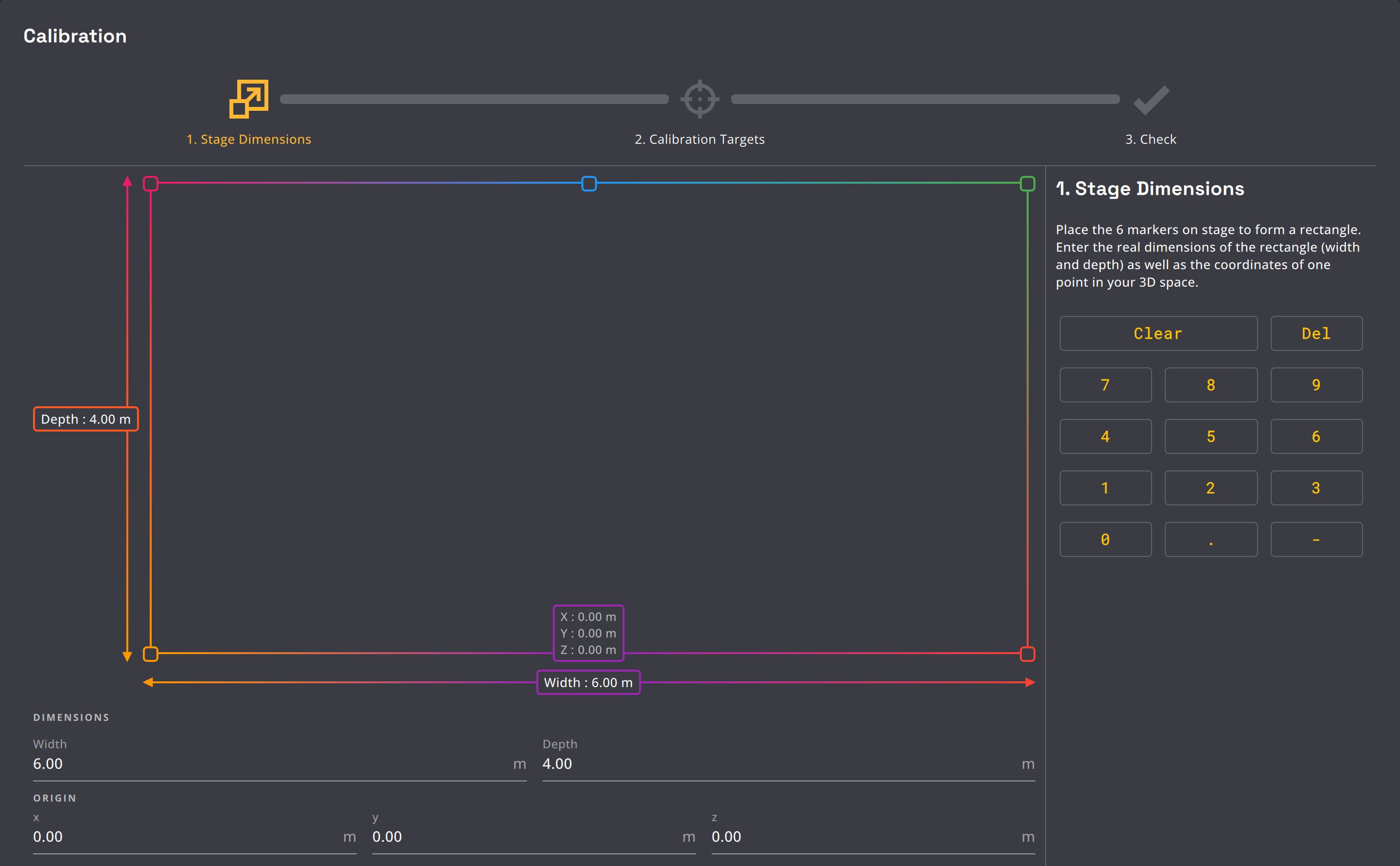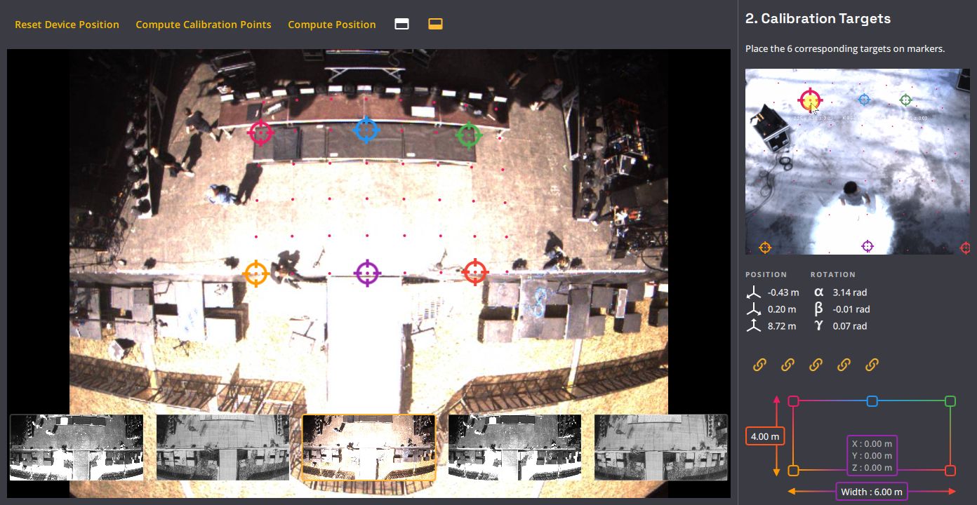 - Calibration targets page, where you match the virtual rectangle on each of the camera viewpoints to the rectangle you draw on the floor.