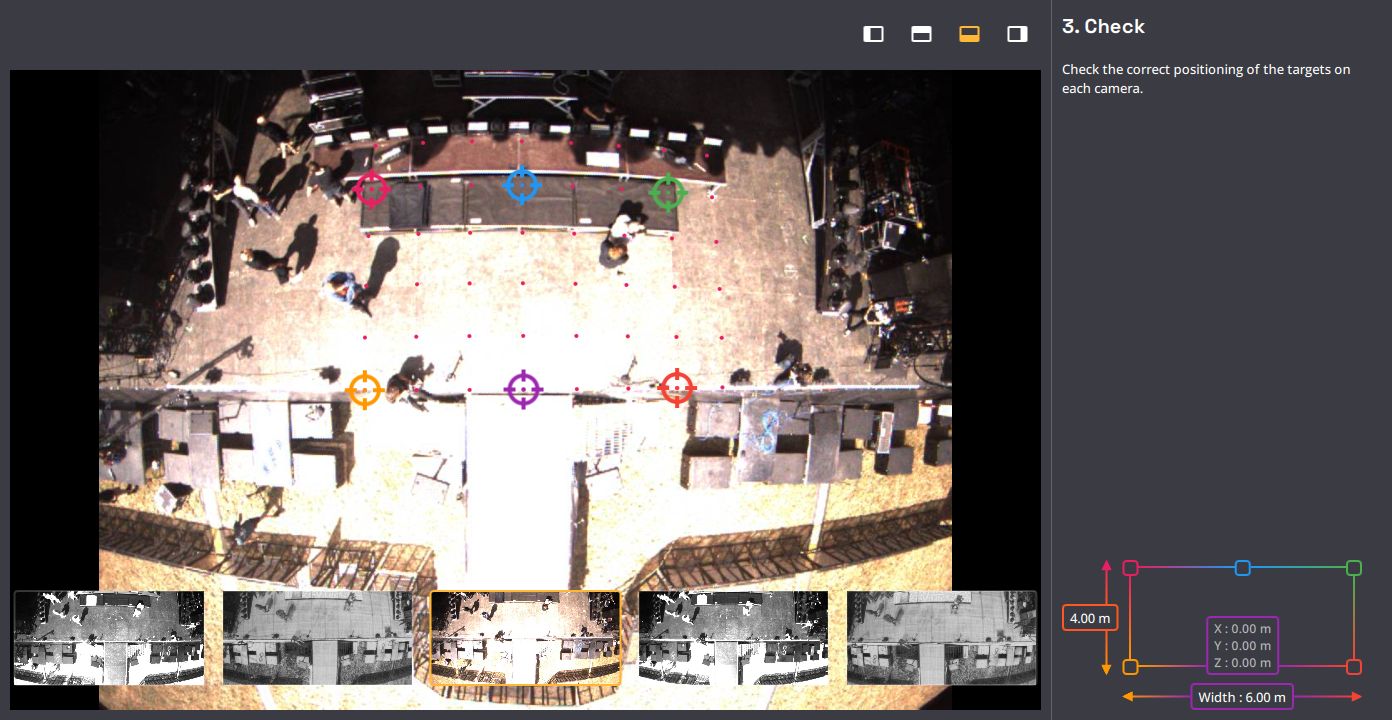 On this page, you have access to the point of view of each of the Kapta's cameras. For each one of them, you will have to drag 6 targets on their corresponding point of the calibration rectangle.
