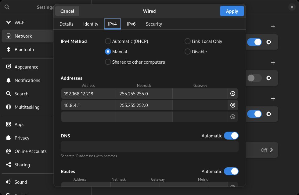 The network card dedicated to the NaoNet network should always have a 192.168.12.XXX/24 IP address.