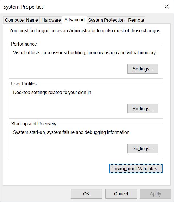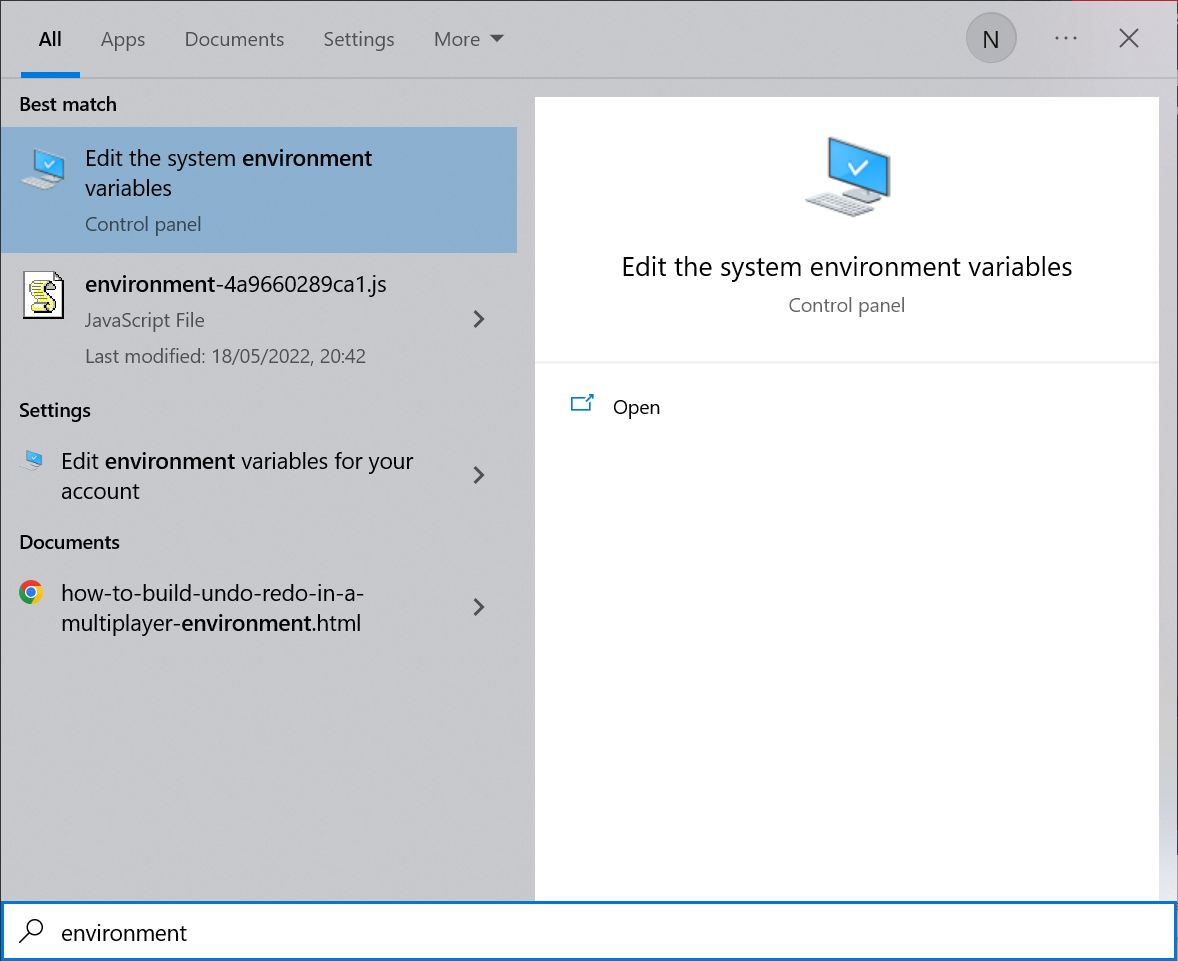 - Search for "Environment variable" in the windows start menu and open the "Edit the system environment variables" option.