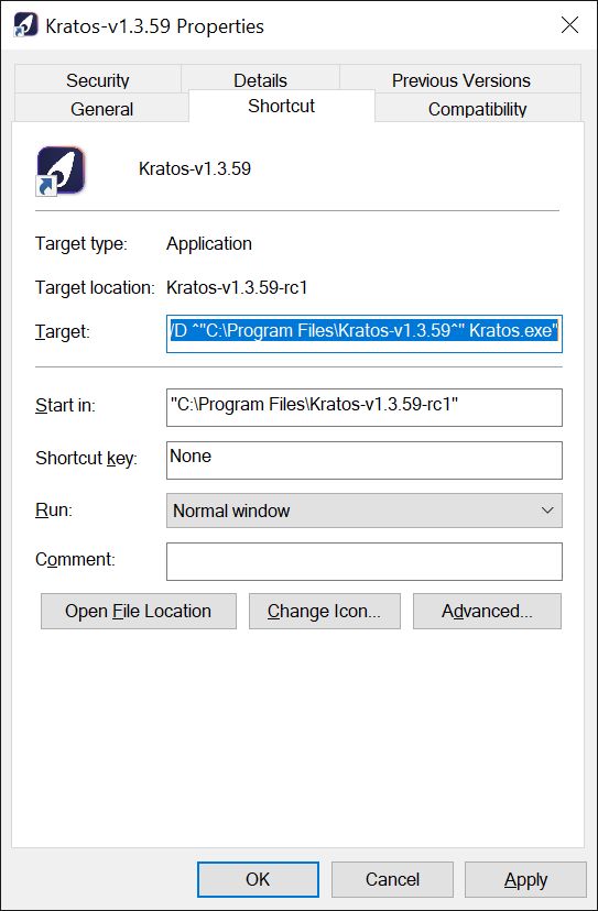 C:\Windows\System32\cmd.exe /c "SET KRATOS_SCALE_FACTOR=<scale_factor> && START /D ^"C:\Program Files\<kratos_install_folder>^" Kratos.exe".- Change