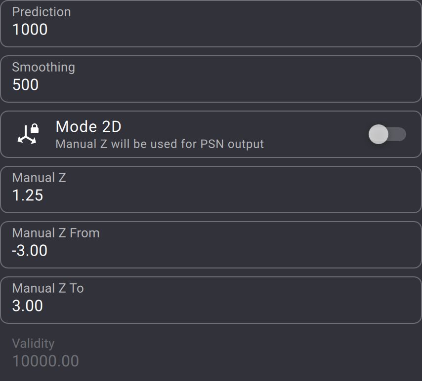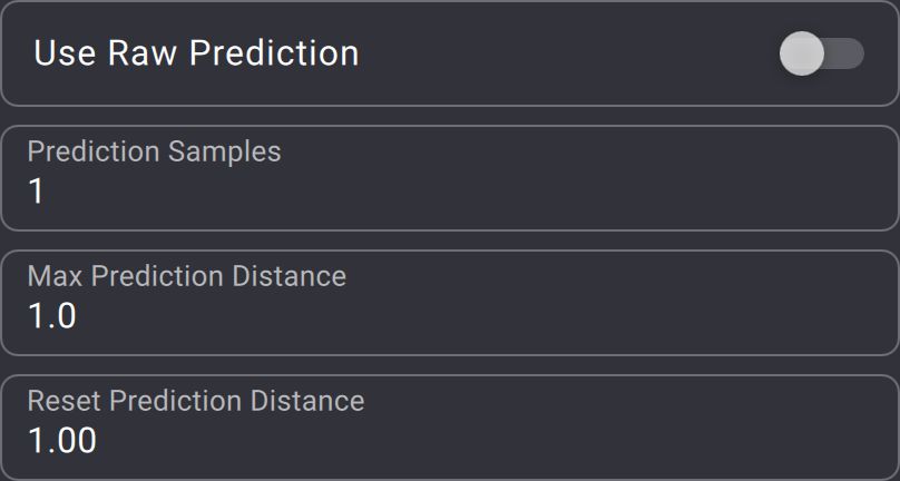 - Prediction : You can use this parameter to predict the position of a Target in function of it's current speed and acceleration. The value chosen corresponds to the time you want to predict ahead in microseconds. This parameter is for example very useful to counter the inertia of lighting fixture during followspot applications.