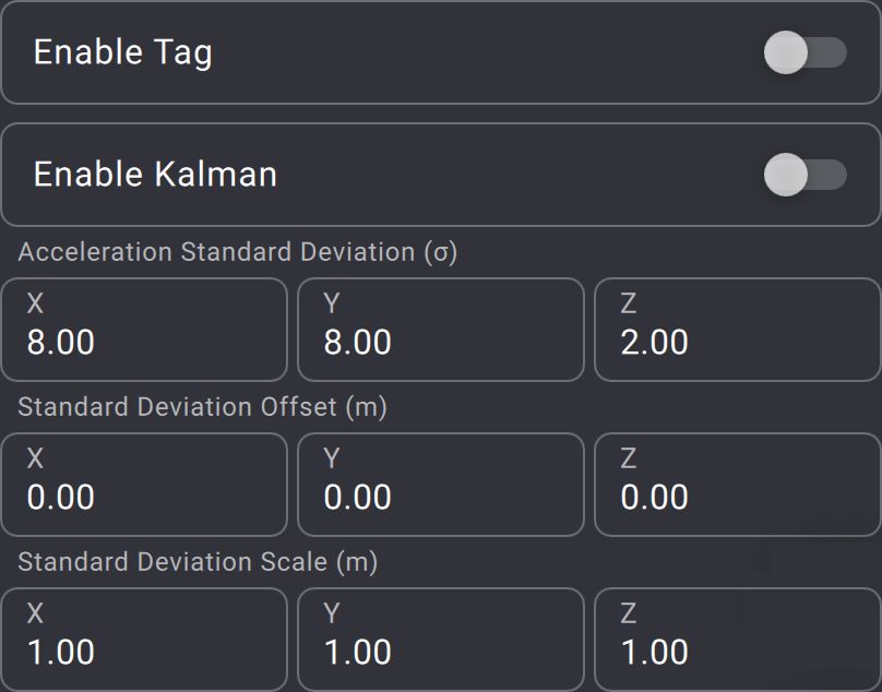 - Enable kalman : If you activate the tag position mode, you can apply a Kalman filter to the tag's position to smooth it out.