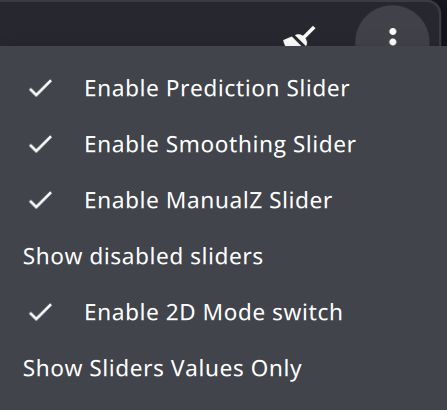 You can choose to disable each post-processing slider by clicking on the menu button located on the top right of the view and unchecking the corresponding option. This can be useful if you don't want to accidentally change a parameter during the show.